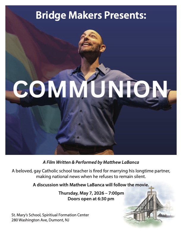 Bridge Makers, a joint ministry of St. Peter the Apostle, River Edge and St. Mary’s Church, Dumont, is a faith sharing community of LGBTQ, family, and friends. Our next meeting is Thursday, March 26th at 7:00 pm at St. Mary’s, 280 Washington Ave, Dumont, in the school. Use the entrance in the parking lot closest to Park Ave. Please contact Deacon John Sylvester at deaconjohn@stmarysdumont.org for further details.